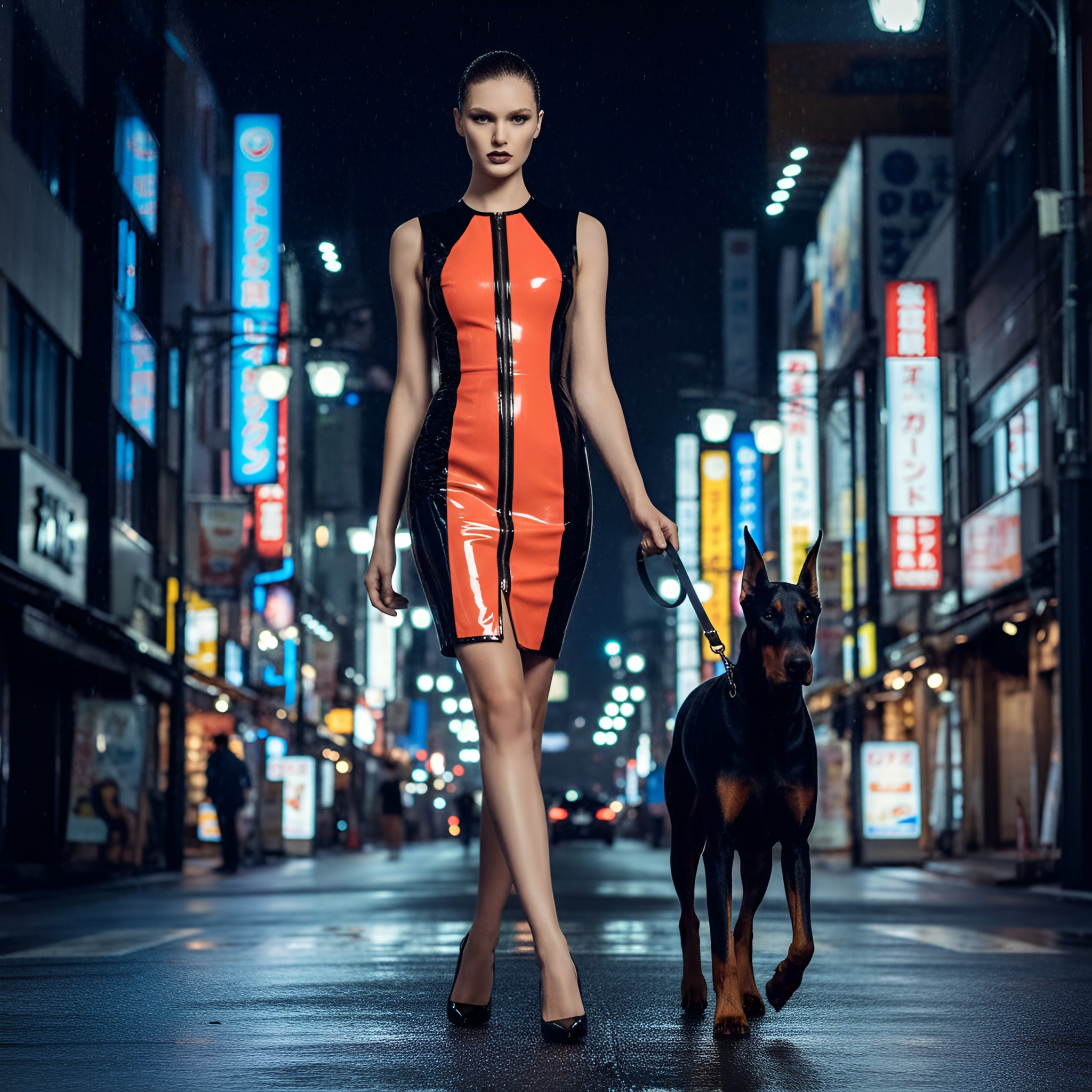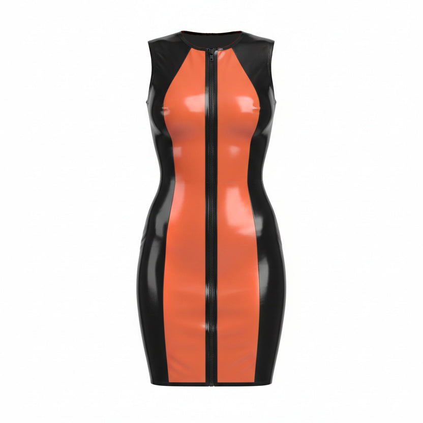 Body-hugging mini dress with a contrast coloured front panel and with a sleeveless cut, collar and matching back zip, crafted from 0.35 mm latex for a sleek, glossy second-skin look.