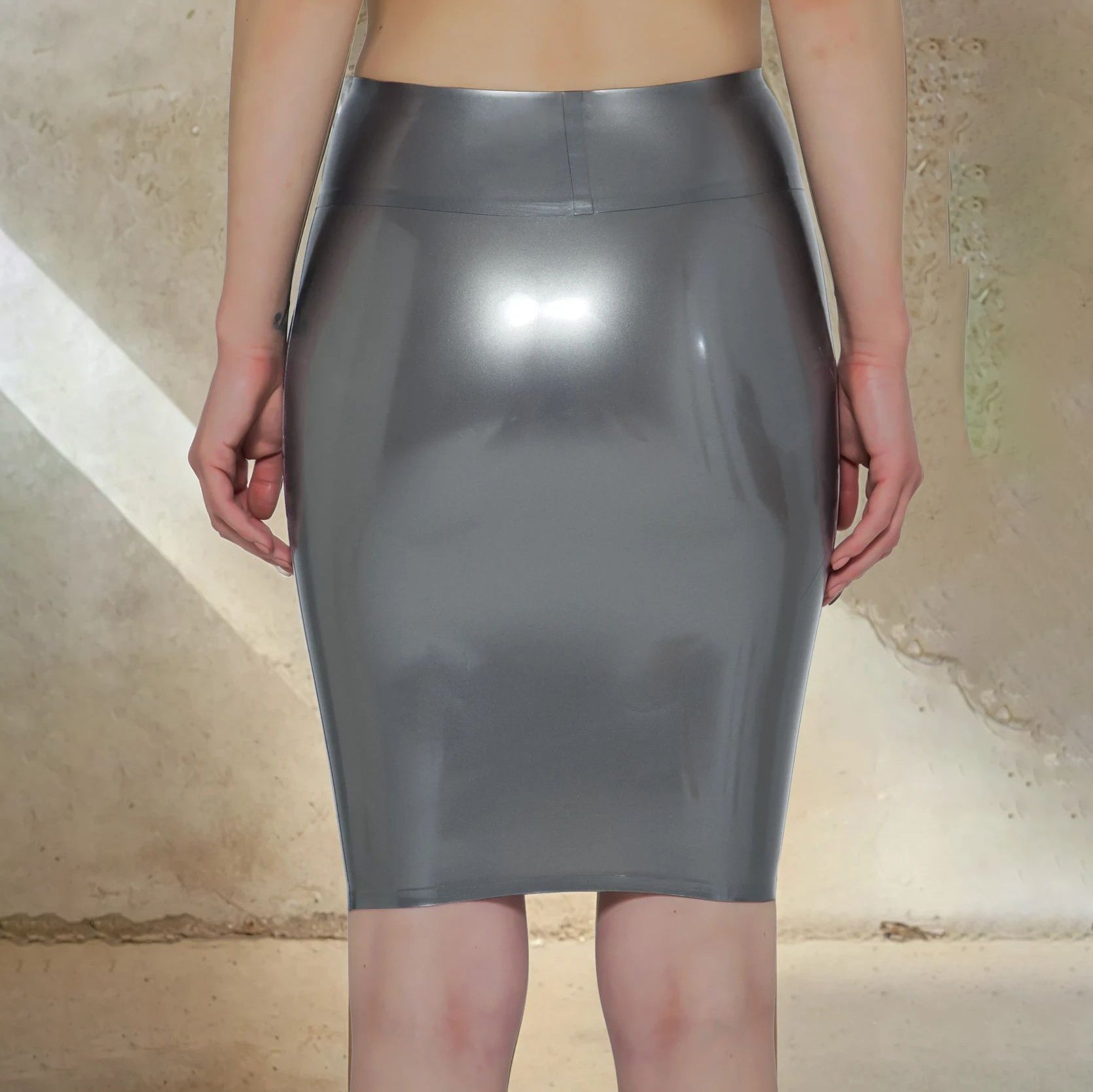 Classic pencil skirt made of 0.35 mm latex, ending just above the knee to subtly reveal the knee.